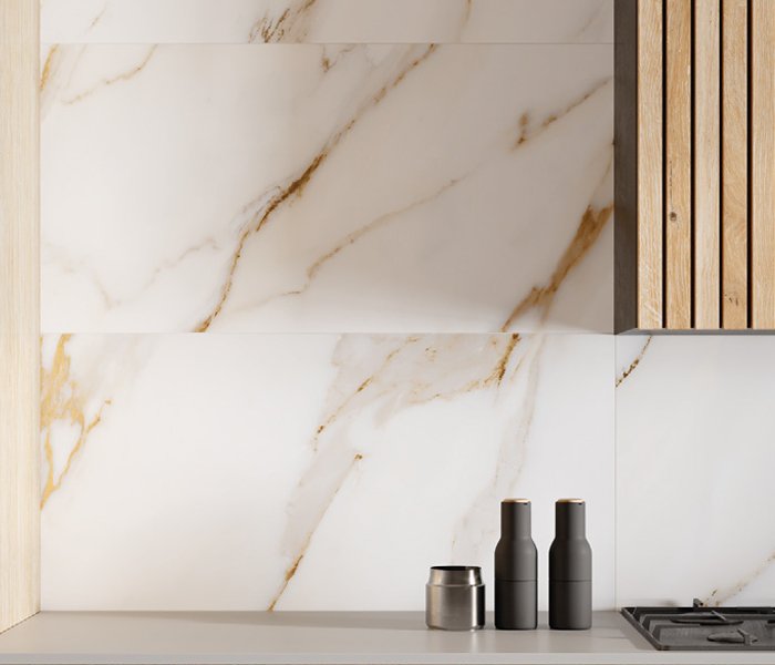 Exclusive marble “reinterpreted” in satin and matte finishing. The calacatta gold is an elegant and sophisticated marble. Veins with golden tones are highlighted over white background. Luxury aesthetics.
