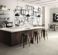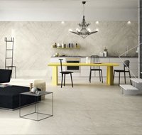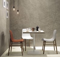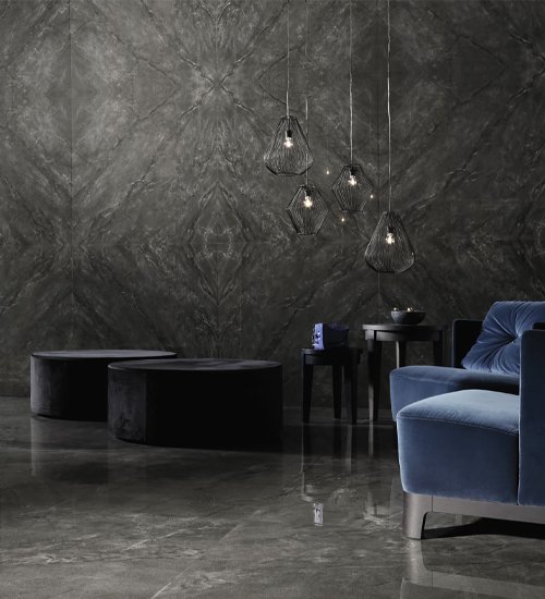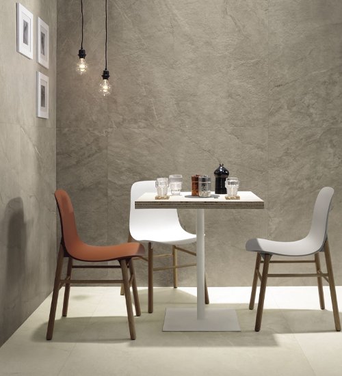 Imola provides two new and striking solutions in the same project, from a technical and aesthetic point of view, that enhance the grained surface of Muse. The refined ceramic details of the line, used as flooring or facing, can be used to achieve prestigious and luxurious sitting rooms, bathrooms, halls, and salons.