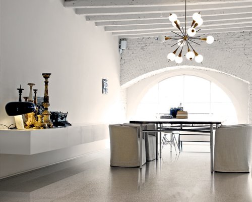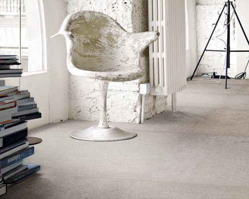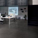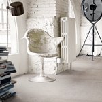 The result is a full-body porcelain stoneware collection with an industrial concrete finish in which every piece is unique, as a series of small multi-coloured chips and flakes that are slightly lighter or darker than the background colour, are scattered over the surface.