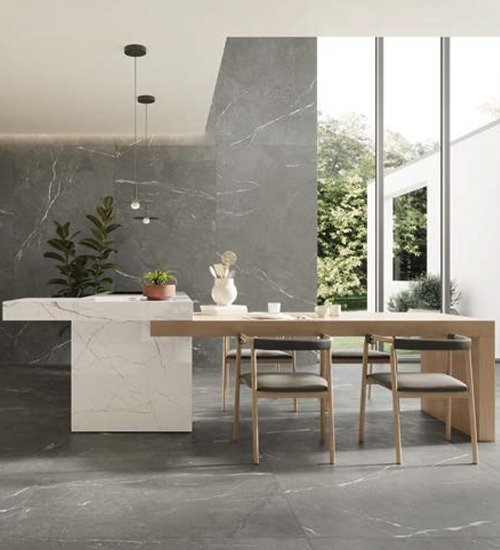 A container of stories that pay homage to five kinds of natural stone that have a significant aesthetic impact. Surfaces that restore the instinctive beauty of the sources of inspiration while simultaneously providing a contemporary twist, proposing completely new variations on a theme - in terms of graphics, colours and size of the details - with a hint of original sophistication.